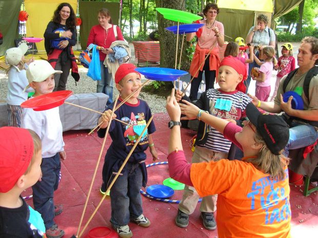 Kinder lernen das Tellerjonglieren in Müllers Jonglier- und Bewegungsprogramm